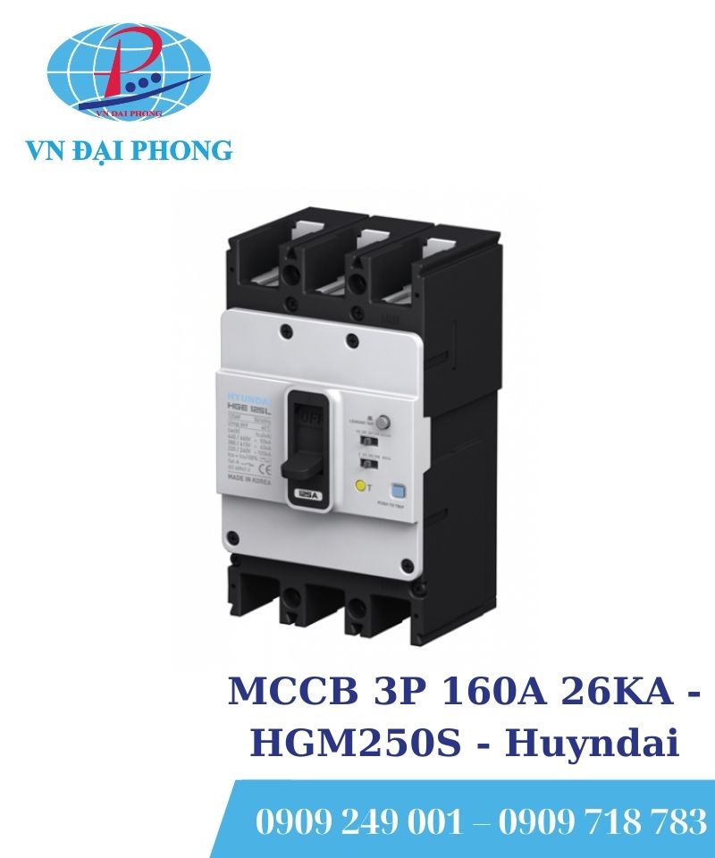 - Tên sản phẩm: Cầu dao tự động MCCB Huyndai 3P 160A 26KA – HGM250S