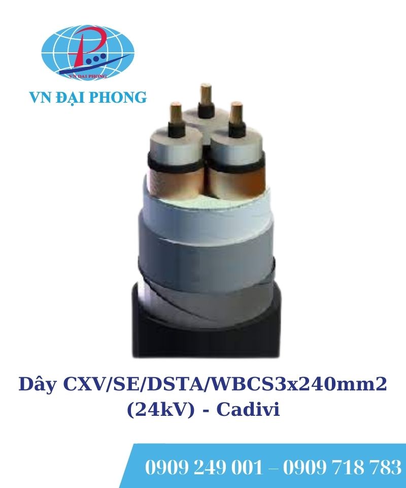 Dây cáp điện Cadivi CXV/SE/DSTA/WBCS 3x240mm² (24kV) là dòng cáp trung thế cao cấp, gồm 3 lõi đồng dẫn điện tiết diện 240mm², được cách điện bằng XLPE, trang bị lớp chống thấm dọc (SE), giáp băng thép hai lớp (DSTA) và dây tiếp địa có bọc cách điện (WBCS), giúp tăng cường khả năng chống nhiễu và đảm bảo an toàn trong vận hành. Sản phẩm được thiết kế chuyên dụng cho hệ thống điện trung thế 24kV, phù hợp sử dụng trong các công trình công nghiệp, trạm biến áp và khu đô thị đòi hỏi tính ổn định và độ bền cao trong môi trường khắc nghiệt.