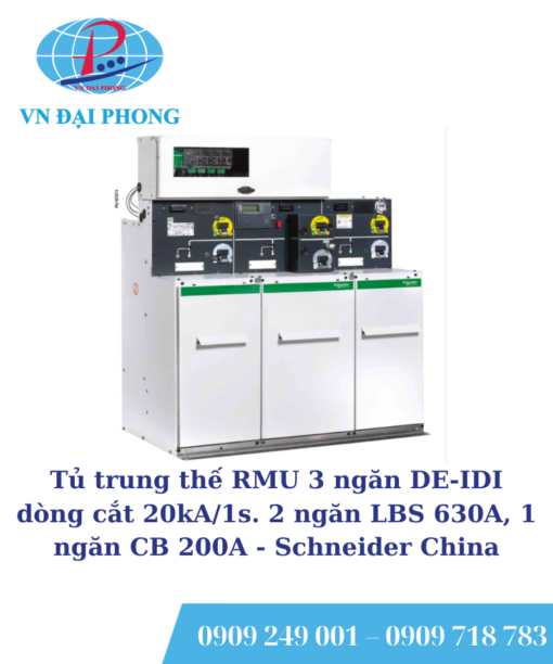 - Tên sản phẩm: Tủ trung thế RMU Schneider 3 ngăn DE-IDI dòng cắt 20kA/1s. 2 ngăn LBS 630A, 1 ngăn CB 200